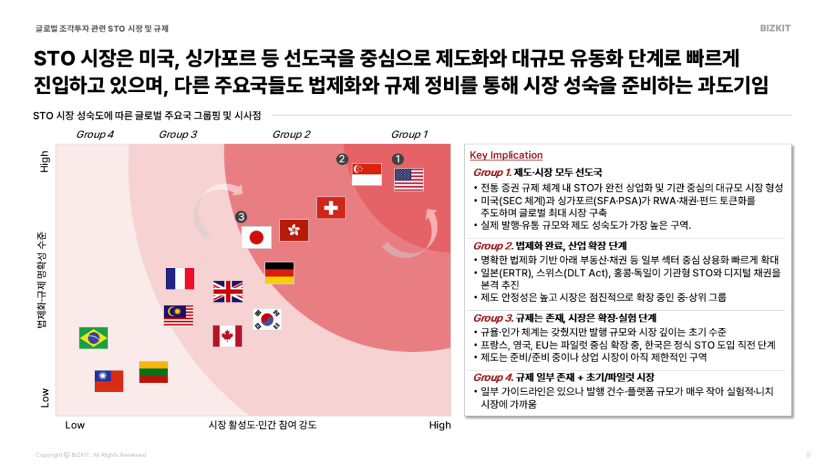 STO 시장은 법제화 명확성과 시장 활성도에 따라 4개 그룹으로 나뉩니다.