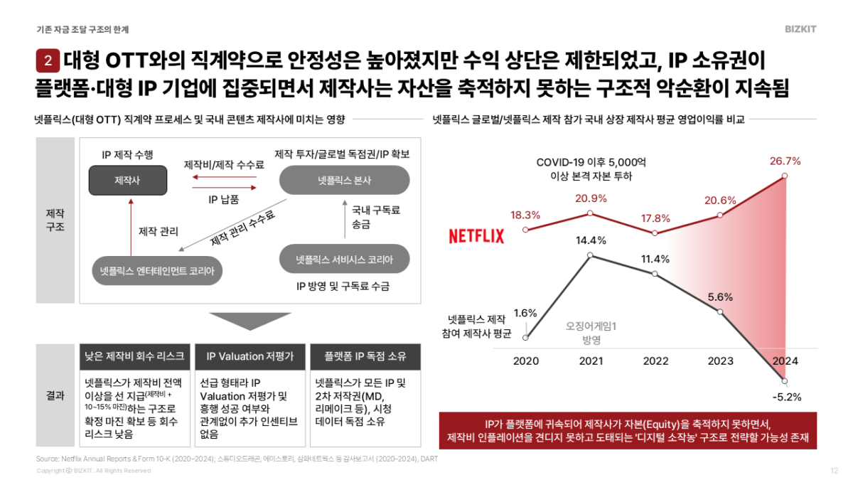 현재의 자금 조달은 내부 자본이나 OTT 직계약, 정책 금융 등 ‘폐쇄적 네트워크’에 과도하게 의존하고 있습니다. 특히 넷플릭스 같은 대형 플랫폼과의 직계약 구조는 제작비와 10~15%의 확정 마진을 보장받아 리스크는 낮지만, 치명적인 한계가 있습니다.