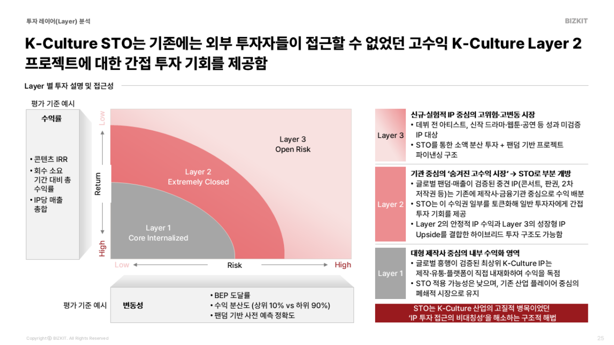 - Layer 2 (부분 개방): 검증된 콘서트 판권, 2차 저작권 수익 등 신뢰도가 높은 자산부터 STO로 구조화하여 트랙레코드를 쌓아야 합니다.