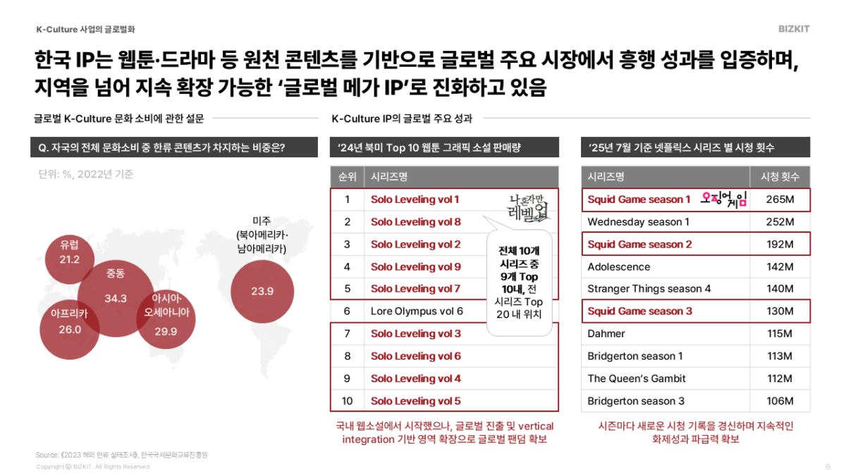 - 웹툰 → 글로벌 흥행: <나 혼자만 레벨업>은 북미 웹툰 판매량 Top 10 중 9개를 휩쓰는 기염을 토했습니다.