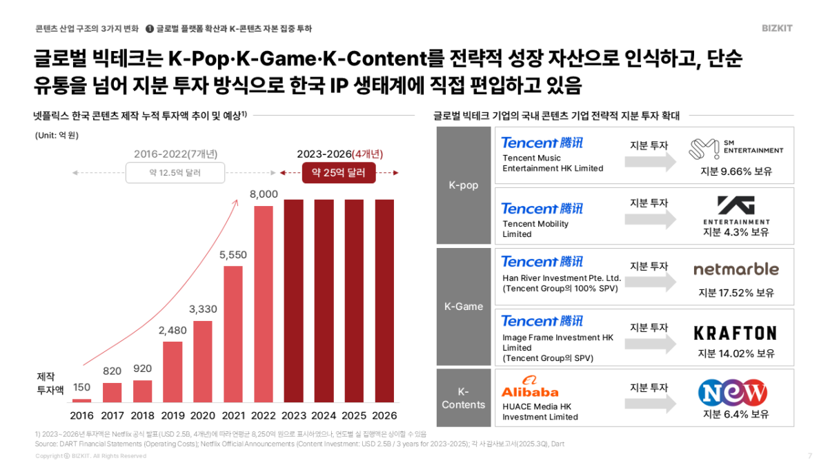 넷플릭스는 2023년부터 2026년까지 한국 콘텐츠에 약 25억 달러(한화 약 3.3조 원)를 투자하겠다고 발표했습니다. 텐센트나 알리바바 같은 빅테크 기업들도 국내 주요 엔터사(SM, 크래프톤 등)의 지분을 공격적으로 확보하며 단순 유통을 넘어 생태계 자체를 소유하려 하고 있습니다.
