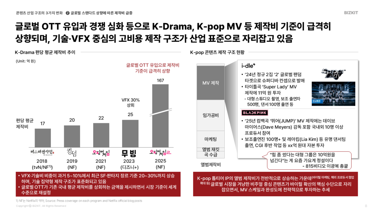 글로벌 OTT의 유입으로 눈높이가 높아지며 제작비가 급상승했습니다.