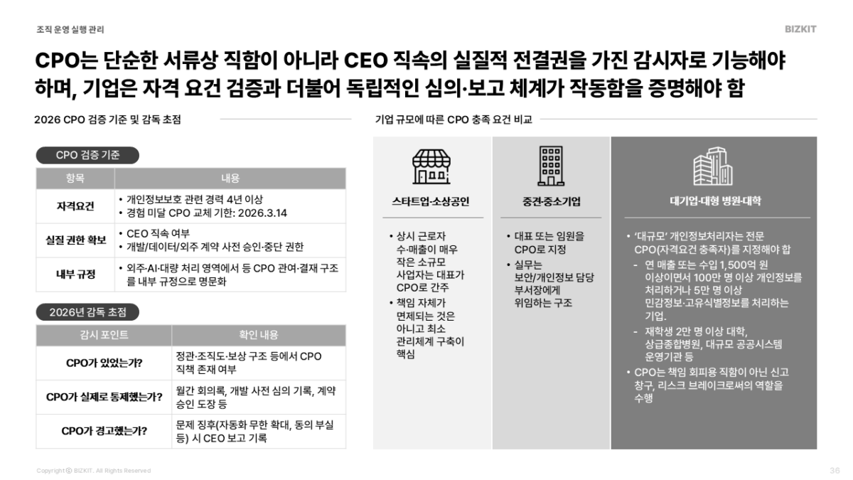 - CPO 권한 명문화: 독립적 의사결정권과 조직도 내 실질 권한 명시