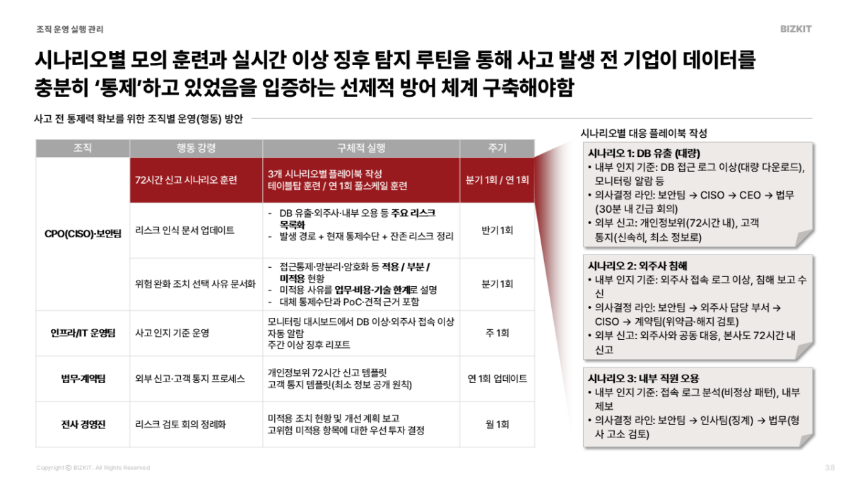 - 72시간 대응 시나리오: 인지부터 신고까지, 실제 훈련 기록 기반의 대응 체계 확보