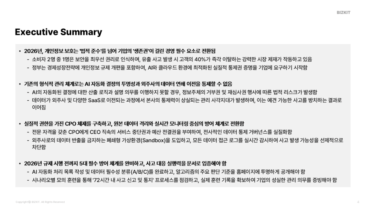 이는 2026년 개인정보보호법 개정 대비가 과태료 방어가 아닌, 개인정보 유출 사고 한 번에 우리 고객 40%가 증발하는 매출 리스크를 막는 일입니다.