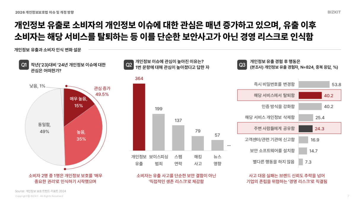 고객은 어떻게 생각할까요? 소비자 2명 중 1명은 개인정보 이슈에 대한 관심이 매년 증가하고 있으며, 유출 이후 소비자는 해당 서비스를 탈퇴하는 등 이를 단순한 보안사고가 아닌 경영 리스크로 인식합니다.