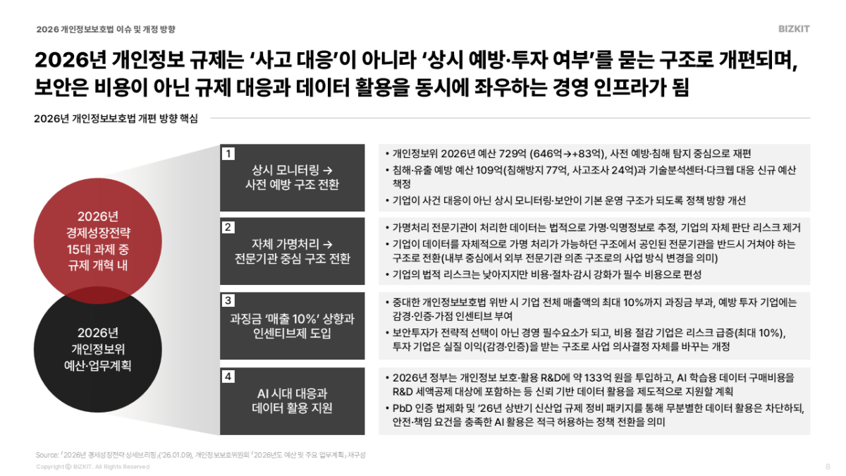 2026년 개인정보 규제는 ‘사고 대응’이 아니라 ‘상시 예방·투자 여부’를 묻는 구조로 개편되며, 보안은 비용이 아닌 규제 대응과 데이터 활용을 동시에 좌우하는 경영 인프라가 되는 것이지요.