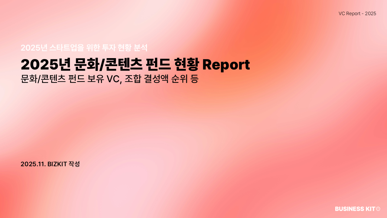 ‘한국 문화펀드 순위’, ‘천억 VC 결성액’, ‘2025년 벤처캐피탈 투자업계’, ‘K-콘텐츠 자금 투자시장’과 같은 핵심 키워드와 함께 투자업계 최신 데이터와 인사이트를 만나보세요.