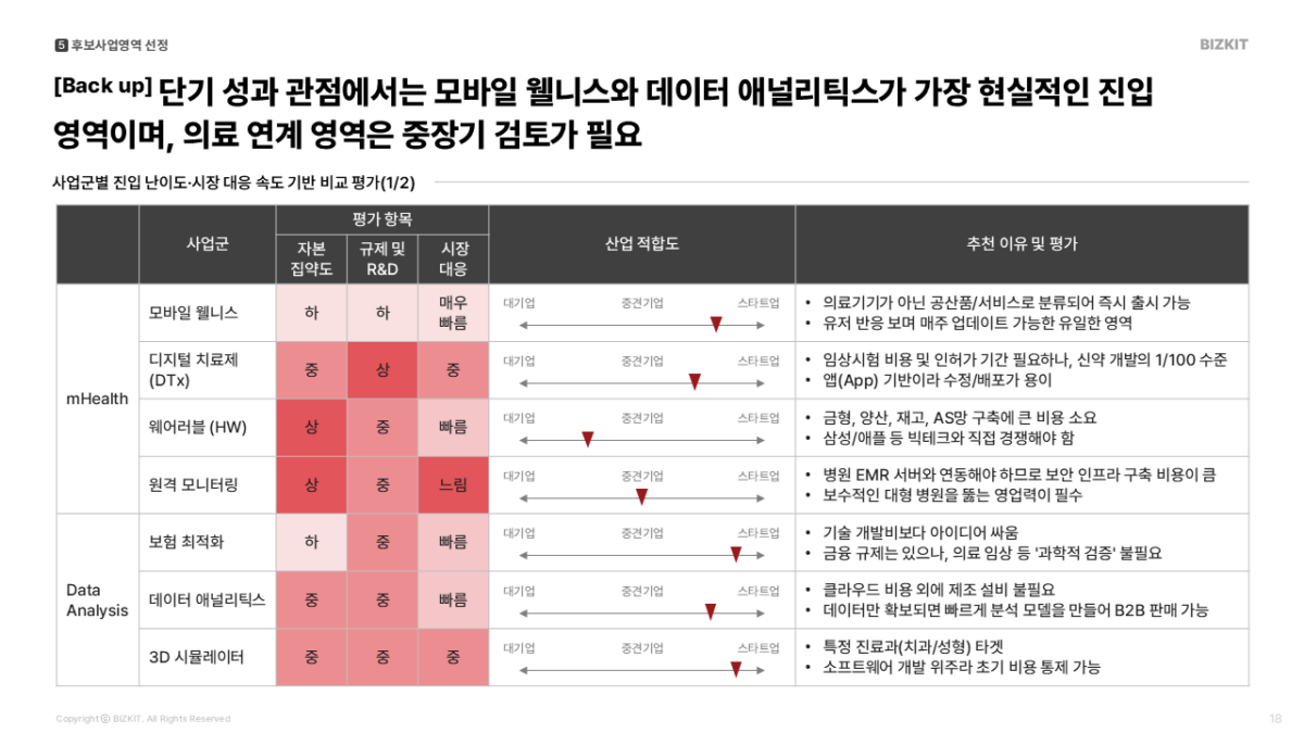 - 후보사업영역 선정 (1·2차 필터링, 사업군별 진입 난이도 비교)