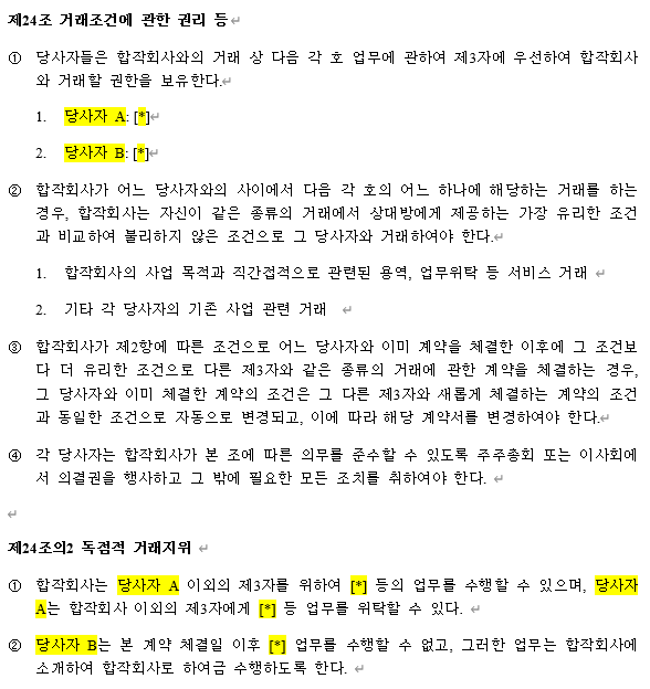 - 우선거래권 / 사업 우선권 조항: JV 내 주요 거래의 우선권 설정