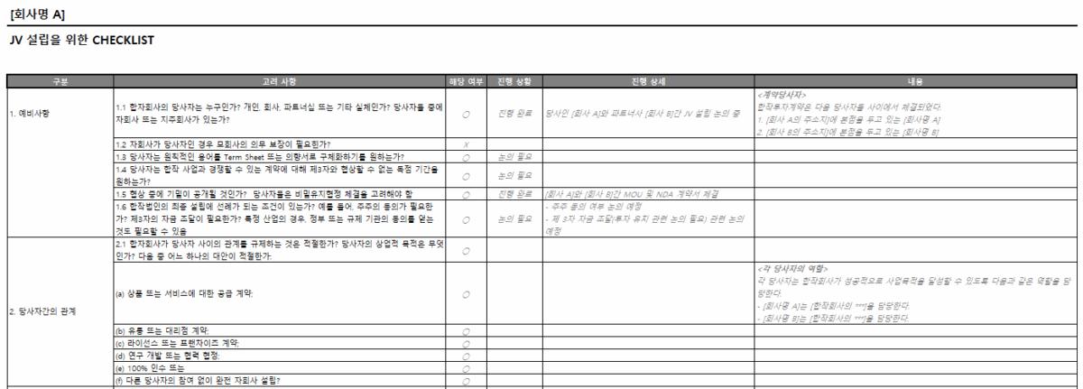 | 1단계. JV 검토 개시 | JV 설립 시트에서 핵심 구조·지분 설계 정리 |