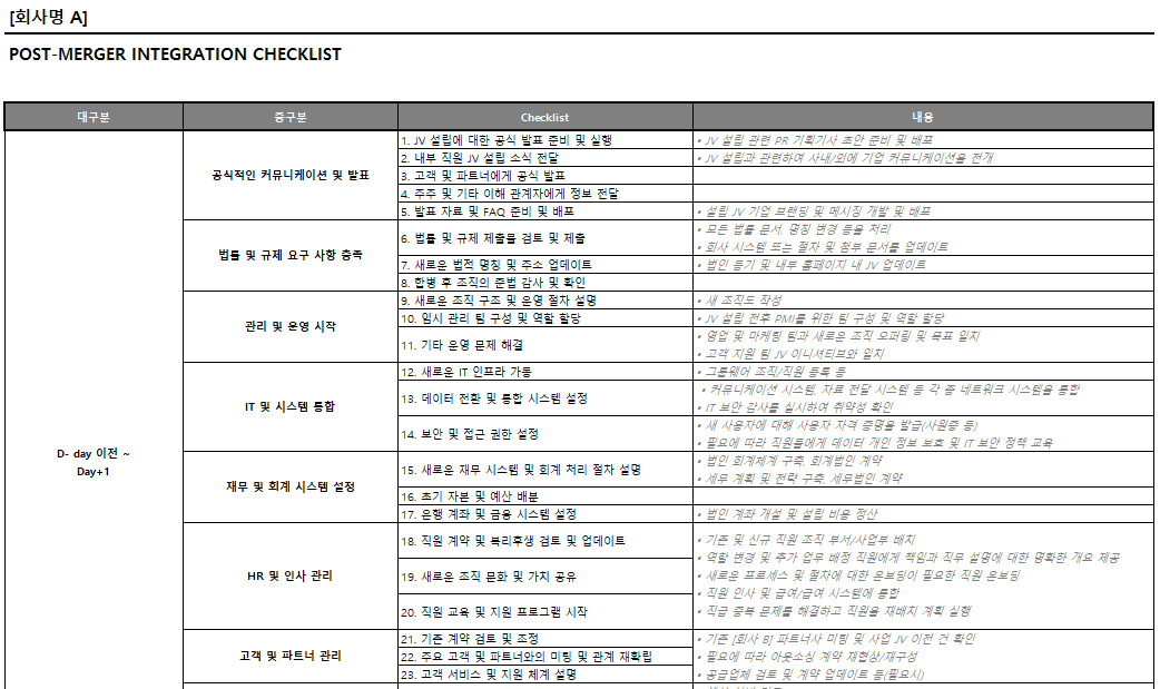| 4단계. JV 출범 후 | R&R 확정 → PMI 시트로 통합 관리 전환 |
