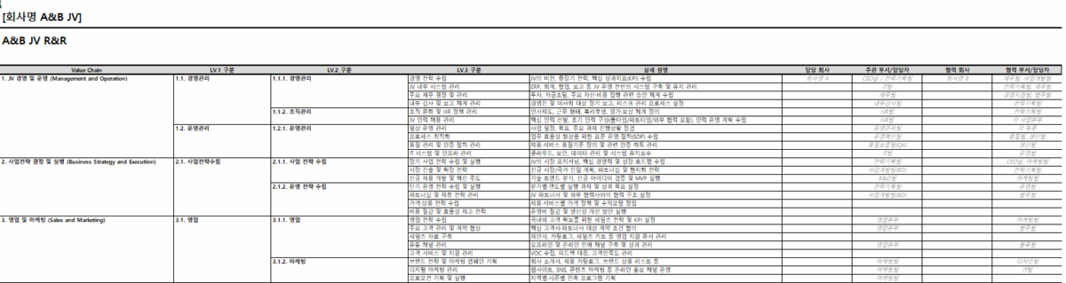 그래서 R&R(Role & Responsibility) 시트는 JV의 안정적인 운영을 위해 꼭 필요합니다.