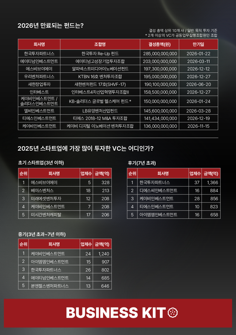 – 신규 결성 펀드, 투자 여력 많은 VC, 우리 산업에 투자한 VC, 2026년 만료되는 펀드, 초기/중기/후기 스타트업에 가장 많이 투자한 VC